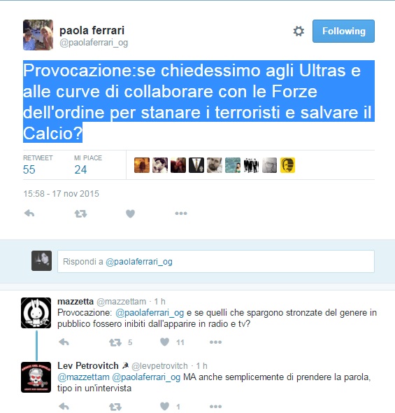 “Provocazione – scrive – se chiedessimo agli Ultras e alle curve di collaborare con le Forze dell’ordine per stanare i terroristi e salvare il Calcio?”.