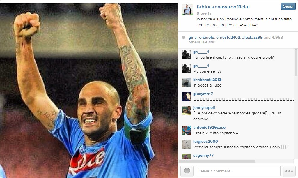 cosi’ Fabio Cannavaro in un tweet saluta polemicamente (destinatario virtuale Aurelio De Laurentiis) il trasferimento del fratello Paolo dal Napoli al Sassuolo.
