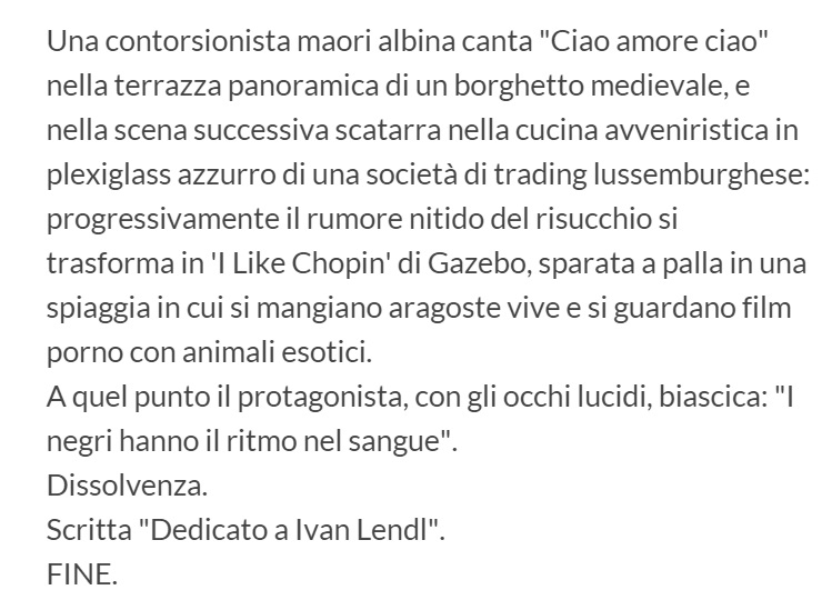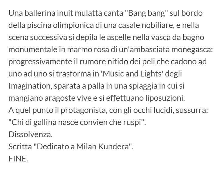 ROMA – “Una modella bielorussa meticcia canta Ciao amore ciao nel giardino botanico tropicale di una casale nobiliare, e nella scena successiva scatarra nella camera da letto damascata di un’ambasciata monegasca”: questa una delle tante scene prodotte dal “generatore automatico di scene del prossimo film di Sorrentino”.