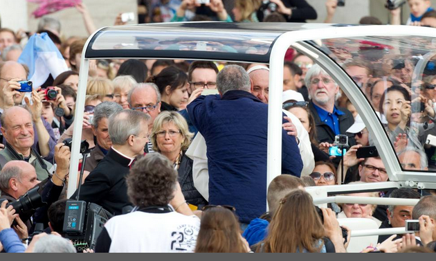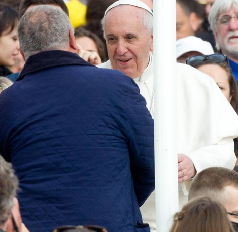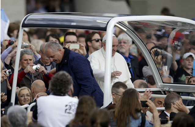 CITTA’ DEL VATICANO – Poco dopo l’inizio del suo giro in una Piazza San Pietro gremita da decine di migliaia di persone per l’udienza generale, papa Francesco ha fatto fermare la “campagnola” avendo visto tra la folla una suo conoscente: l’uomo quindi ha scavalcato la transenna, si è avvicinato all’auto del Papa che l’ha fatto salire, rimanendo con lui a parlare alcuni istanti, mani nelle mani.