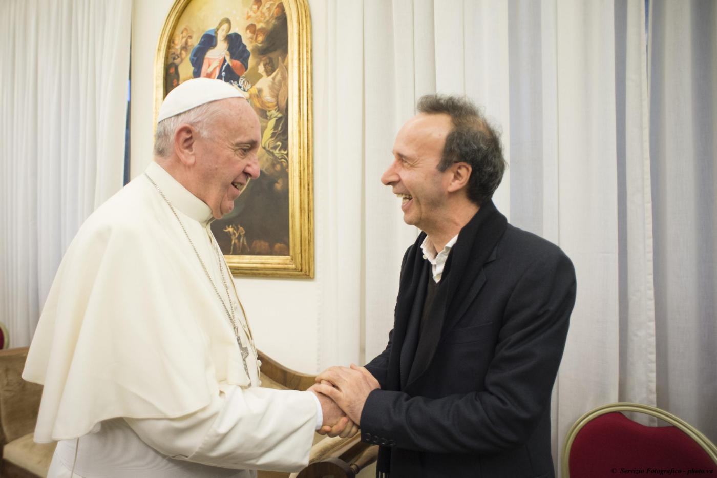Dal Pap’Occhio, passando dal ‘Wojtylaccio’, per arrivare all’abbraccio con Papa Francesco, “l’uomo più grande del mondo, meraviglioso, umile, rivoluzionario”. Roberto Benigni oggi era in Vaticano per presentare il libro-conversazione tra il Papa e il giornalista Andrea Tornielli (“Il nome di Dio è Misericordia”, edito da Piemme). Battute, risate, ma anche un visibile innamoramento di questo nuovo corso della Chiesa e del fatto che “la gioia è il gigantesco segreto del cristianesimo”.