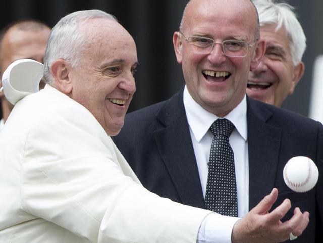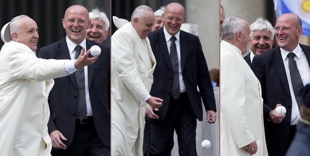 VATICANO – Piccolo fuori programma di Papa Francesco poco prima dell’udienza in Piazza San Pietro. Il pontefice afferra al volo una pallina di baseball lanciata da un fedele ed ha qualche difficoltà a trattenerla.
