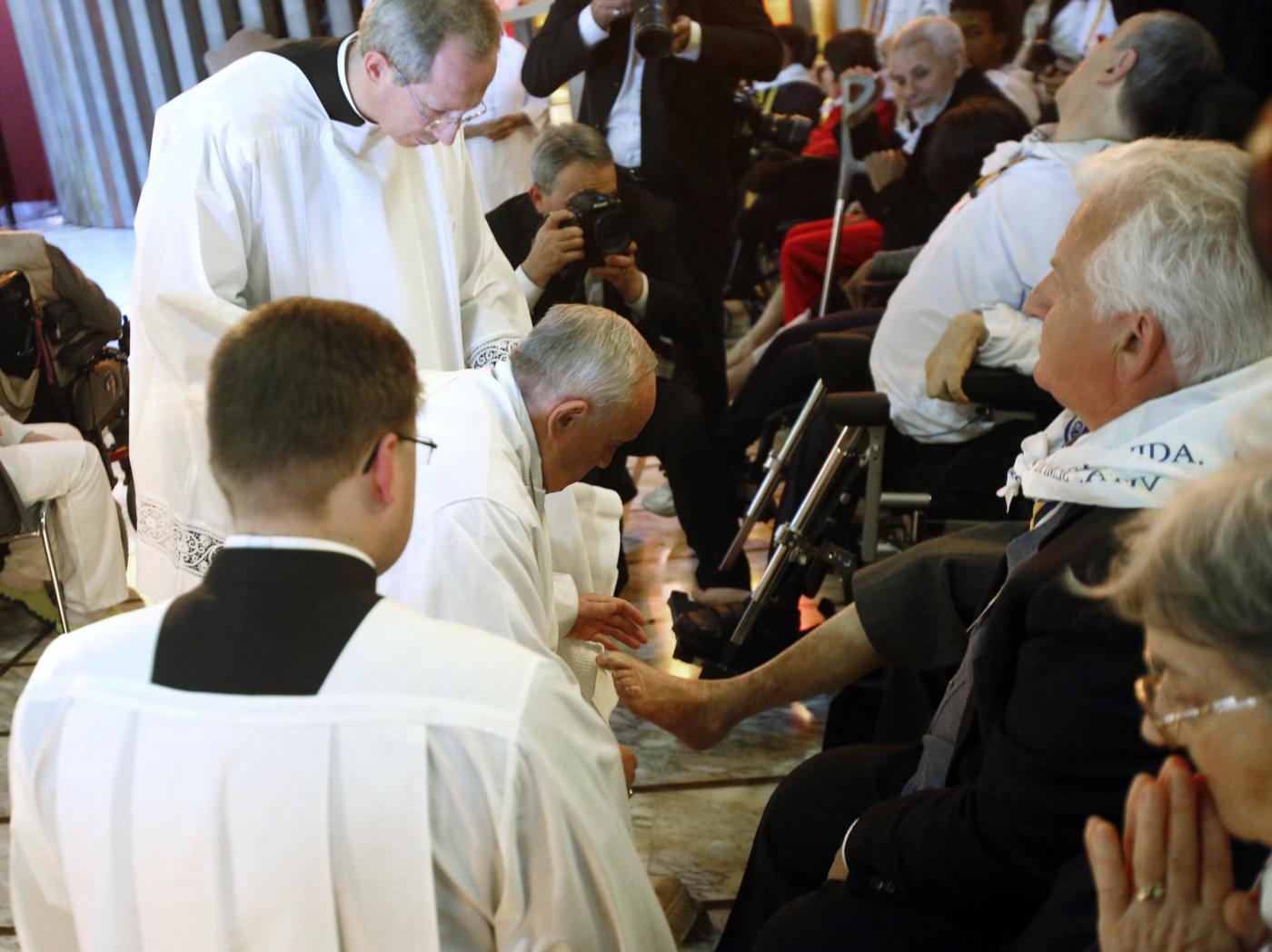 “Adesso – ha concluso il Papa – io farò questo gesto: ma tutti noi, nel cuore nostro, pensiamo agli altri, pensiamo all’amore che Gesù ci dice che dobbiamo avere per gli altri. E pensiamo anche come possiamo servire meglio le altre persone”. Quindi, facendosi lui stesso “servitore”, con la semplice veste bianca e la stola di traverso come la indossano i diaconi, si è inginocchiato a lavare e baciare i piedi ai dodici disabili.
