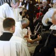 ROMA – Come un umile “servitore” si è inginocchiato davanti a dodici disabili, lavando, asciugando e baciando i loro piedi. A ciascuno di loro, prima di rialzarsi, ha riservato il suo sorriso, come una “carezza” da parte del Papa per i più fragili e svantaggiati. E’ stata ancora un’immersione nelle “periferie esistenziali” la messa In coena Domini di Papa Francesco, che nel pomeriggio del Giovedì Santo apre il triduo pasquale.