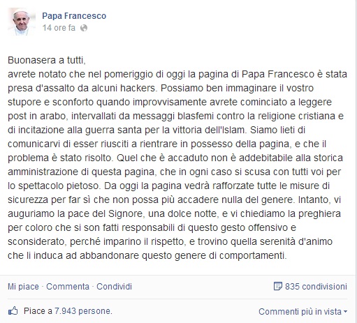 avrete notato che nel pomeriggio di oggi la pagina di Papa Francesco è stata presa d’assalto da alcuni hackers. Possiamo ben immaginare il vostro stupore e sconforto quando improvvisamente avrete cominciato a leggere post in arabo, intervallati da messaggi blasfemi contro la religione cristiana e di incitazione alla guerra santa per la vittoria dell’Islam. Siamo lieti di comunicarvi di esser riusciti a rientrare in possesso della pagina, e che il problema è stato risolto. Quel che è accaduto non è addebitabile alla storica amministrazione di questa pagina, che in ogni caso si scusa con tutti voi per lo spettacolo pietoso.Da oggi la pagina vedrà rafforzate tutte le misure di sicurezza per far sì che non possa più accadere nulla del genere. Intanto, vi auguriamo la pace del Signore, una dolce notte, e vi chiediamo la preghiera per coloro che si son fatti responsabili di questo gesto offensivo e sconsiderato, perché imparino il rispetto, e trovino quella serenità d’animo che li induca ad abbandonare questo genere di comportamenti”.