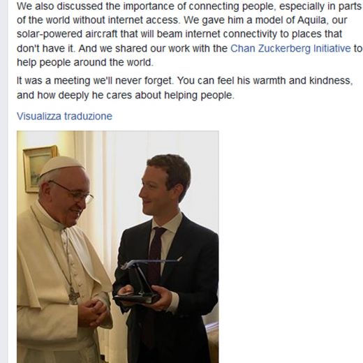 Lunedì 29 agosto Zuckerberg e la moglie Priscilla hanno raggiunto Roma, dopo aver visitato i luoghi del terremoto tra Amatrice ed Accumuli in aeroplano, dove hanno incontrato il Papa. A parlare dell’esperienza è proprio Zuckerberg, che sottolinea come il calore del pontefice si avverta con forza, e su Facebook ha scritto un post: