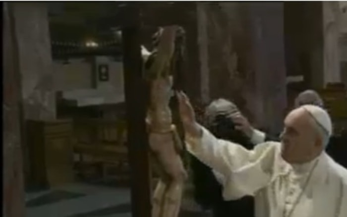 Papa Francesco prega davanti al corpo di Padre Pio (da Sat 2000, foto Ansa)