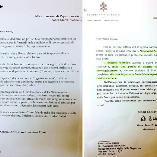 “Carissimo papa Francesco, saremmo lieti se riuscisse a dedicarci un po’ del Suo tempo per ascoltarci, con un incontro alla Sua presenza, per informarla sulla condizione di molte centinaia di nuclei familiari in ‘emergenza abitativa’ che rappresentiamo”,