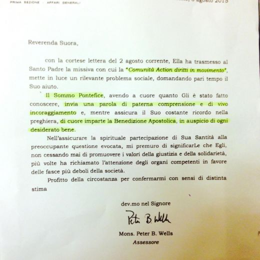 “Papa Francesco – si legge in un messaggio a firma dell’assessore della Segretaria di Stato mons. Brian Wells e recapitato ad una suora che ha fatto da collegamento – invia una parola di paterna comprensione e di vivo incoraggiamento. Nell’assicurare la spirituale partecipazione di Sua Santità alla preoccupante questione evocata mi premuro di significarle che Egli non cessando mai di promuovere i valori della giustizia e della solidarietà, più volte ha richiamato l’attenzione degli organi competenti i favore delle fasce più deboli della società”.