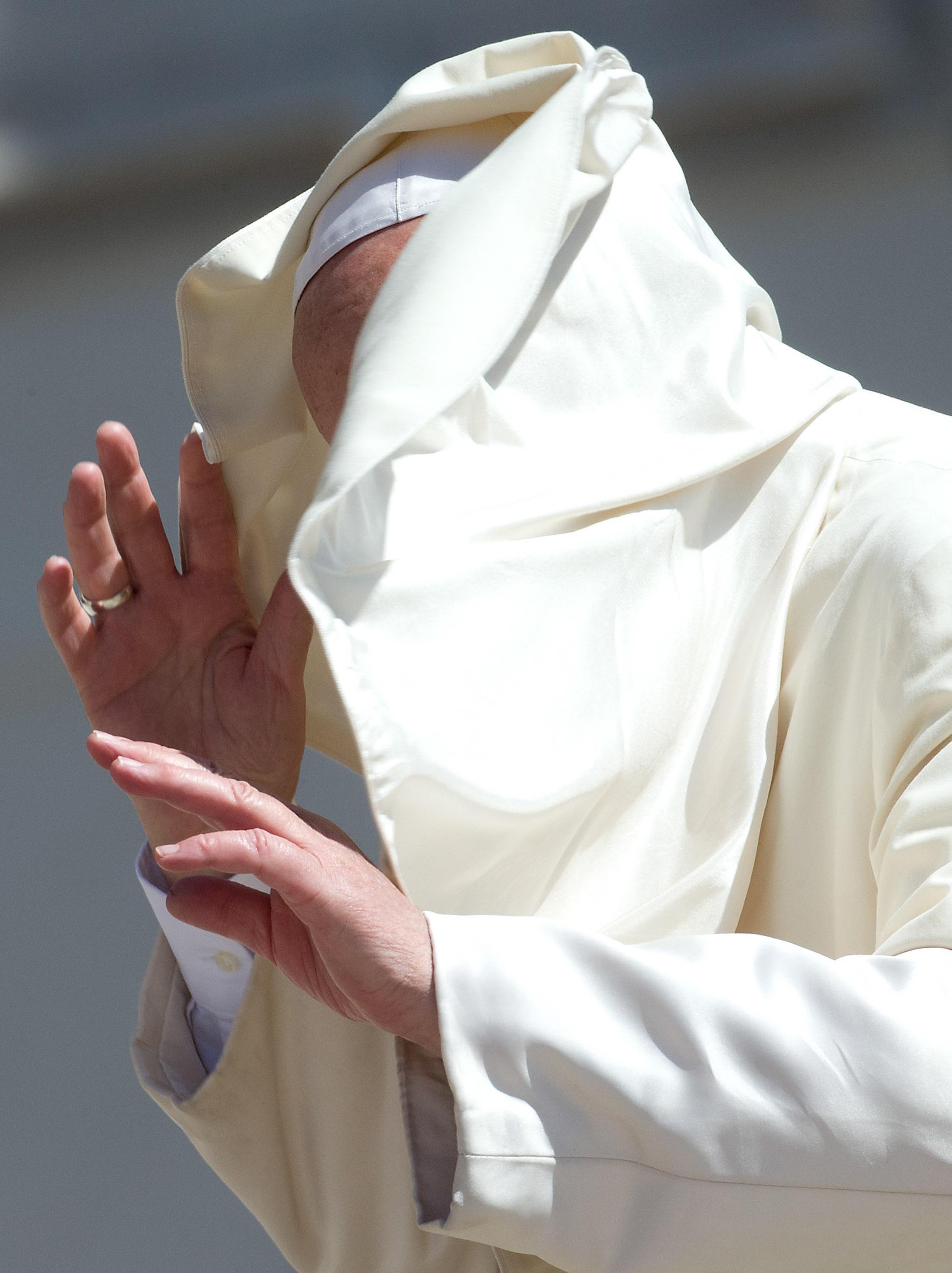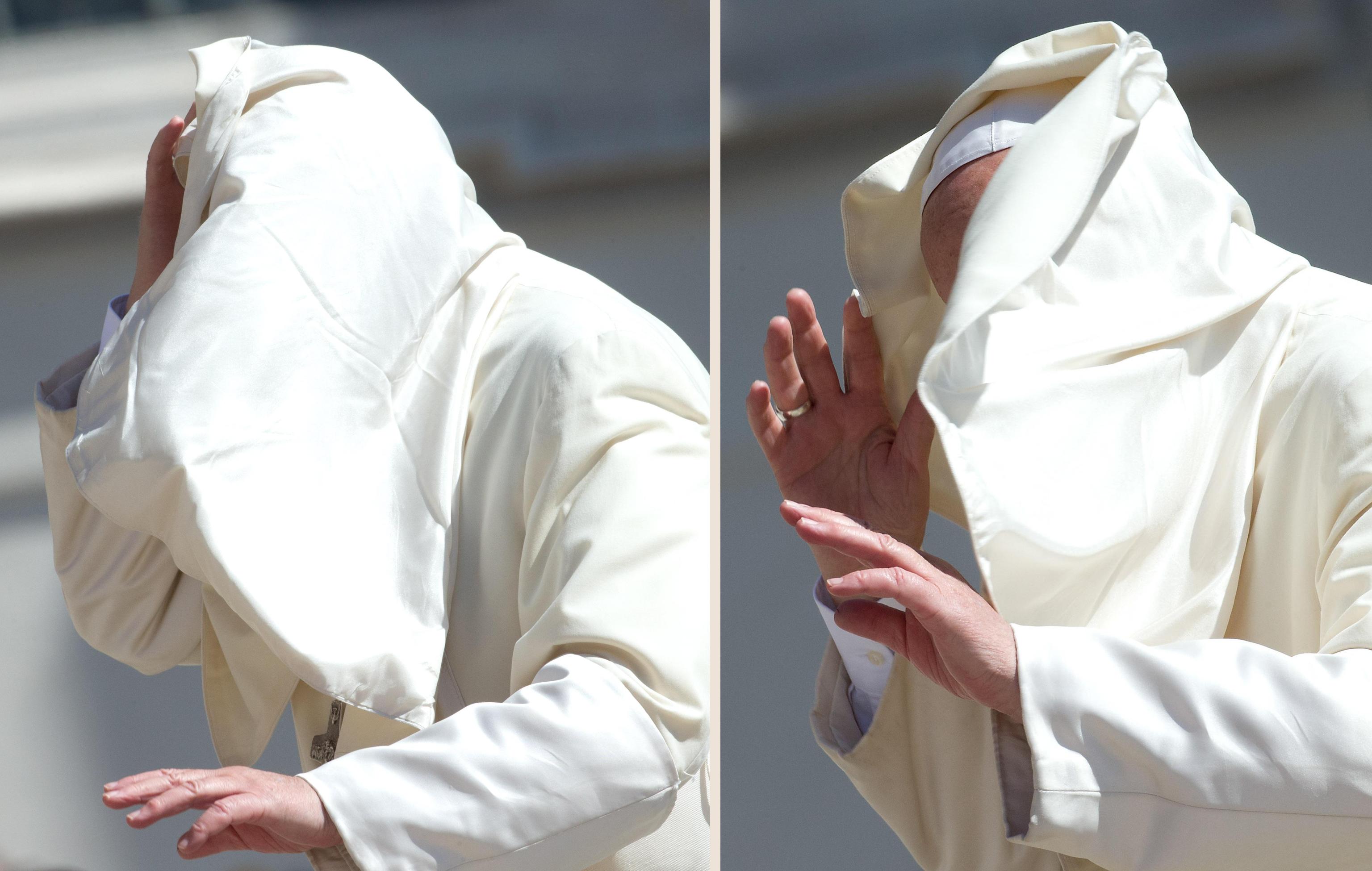 CITTA’ DEL VATICANO – La mantellina non vuole proprio saperne di restare al suo posto. I palloncini si piazzano davanti al suo viso per via del vento e lo zuccotto vola via.