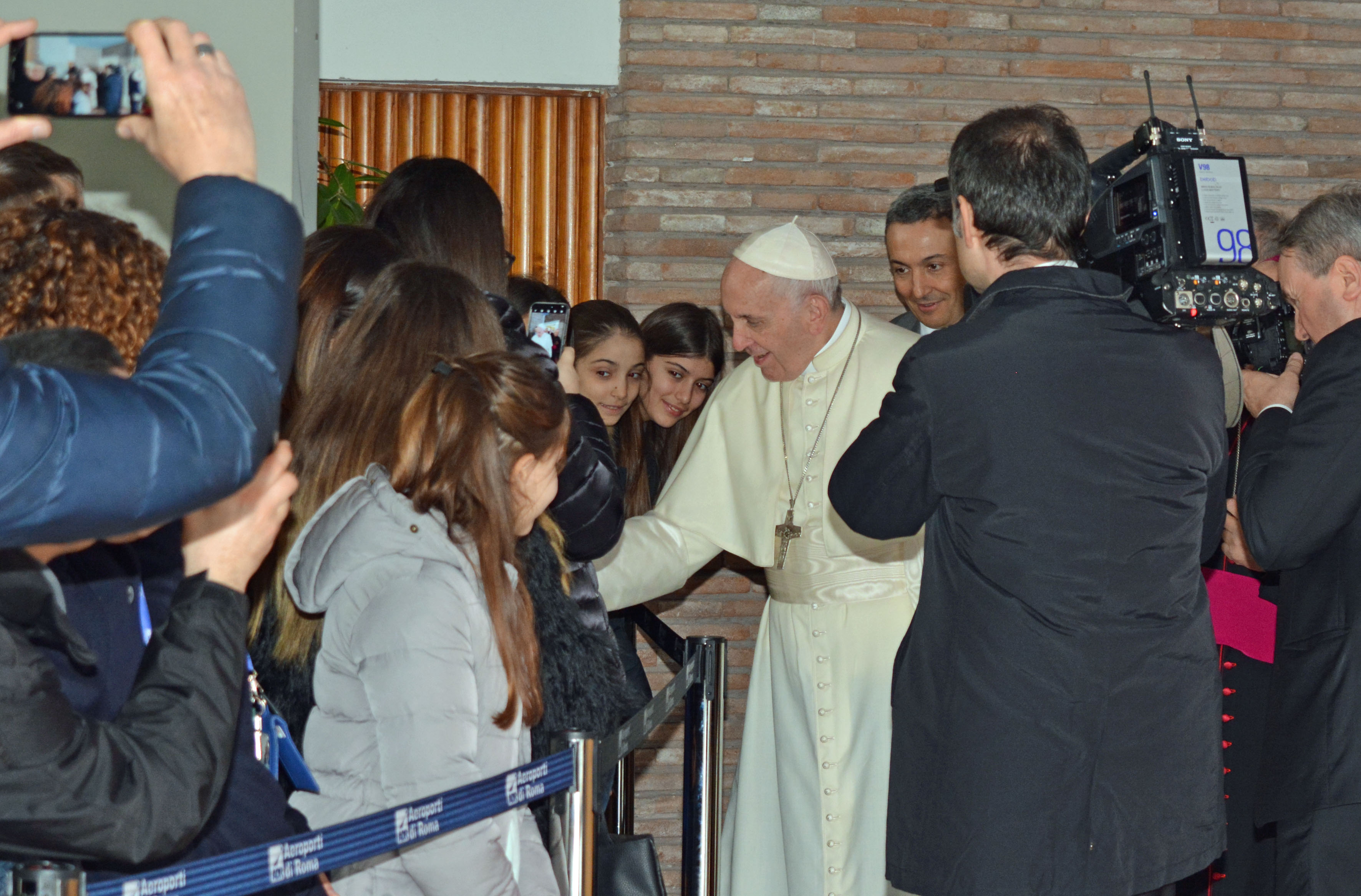 Qui, ad accoglierlo, c’è il presidente e l’amministratore delegato di Aeroporti di Roma, Antonio Catricalà e Ugo de Carolis, il vescovo della diocesi di Porto-Santa Rufina, mons. Gino Reali, e il parroco Giovanni Soccorsi.