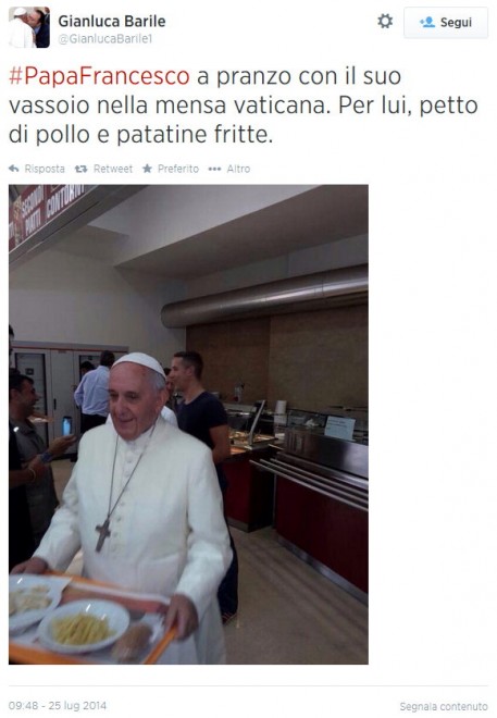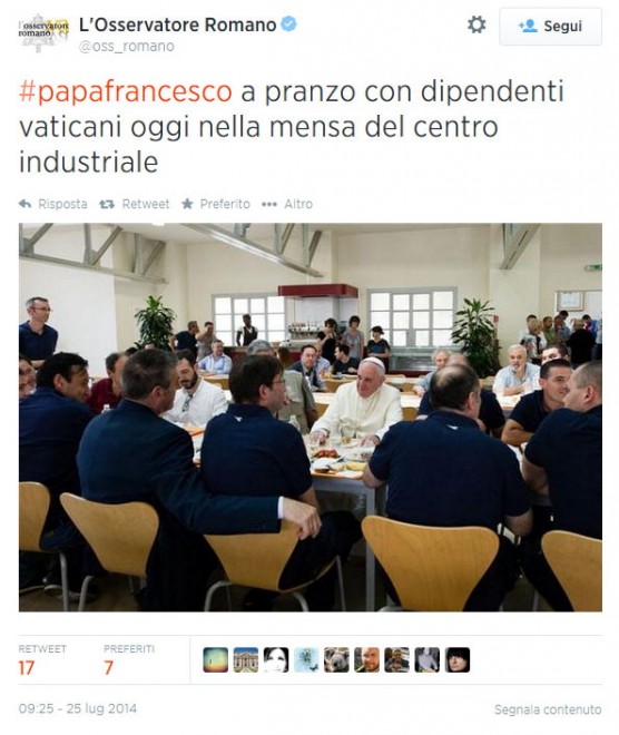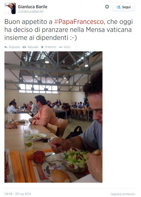 CITTA’ DEL VATICANO – Alla tavola della mensa vaticana, dove oggi 25 luglio è arrivato a sorpresa per pranzare con i dipendenti, papa Francesco si è seduto accanto a cinque magazzinieri della Farmacia vaticana, in polo blu a maniche corte. “Gli abbiamo descritto il nostro lavoro, quanti siamo a farlo e come si svolge. E lui ci ha parlato delle sue origini italiane”, spiega uno dei commensali all’Osservatore Romano.