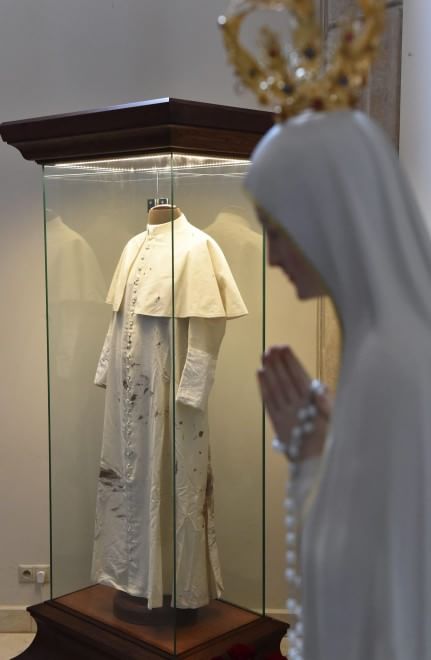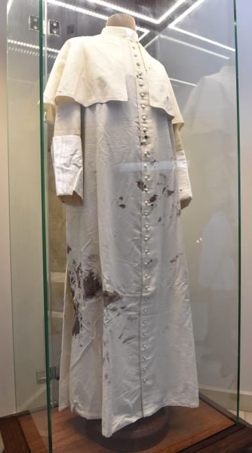 La talare bianca è conservata in una teca di vetro ed è ancora macchiata con le tracce del sangue del pontefice. I motivi dell’attacco, avvenuto il 13 maggio alle ore 17.19, non sono mai stati chiariti del tutto. L’attentatore turco fu perdonato dal papa e ricevette la grazia da Carlo Azeglio Ciampi. Papa Francesco ha proclamato santo Giovanni Paolo II lo scorso anno insieme a Giovanni XXIII (foto Ansa).