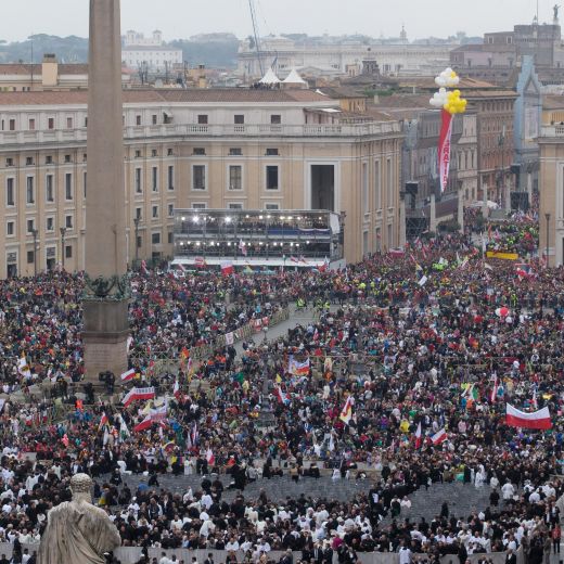 Grande l’ovazione degli 800 mila pellegrini (500 mila in Piazza San Pietro e Via della Conciliazione e altri 300 mila nelle altre aree di Roma allestite con maxi-schermi) al momento della formula con cui Bergoglio ha proclamato la santità dei due predecessori.