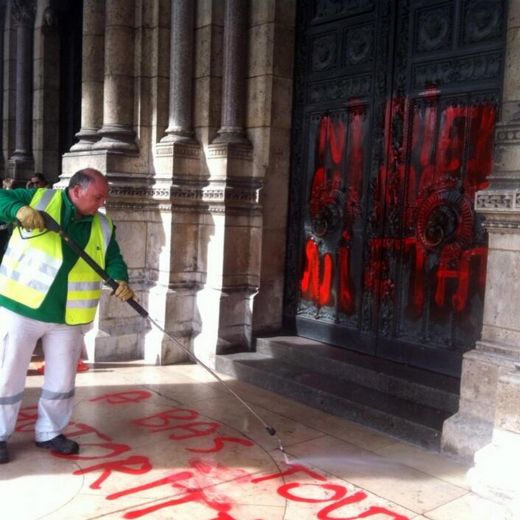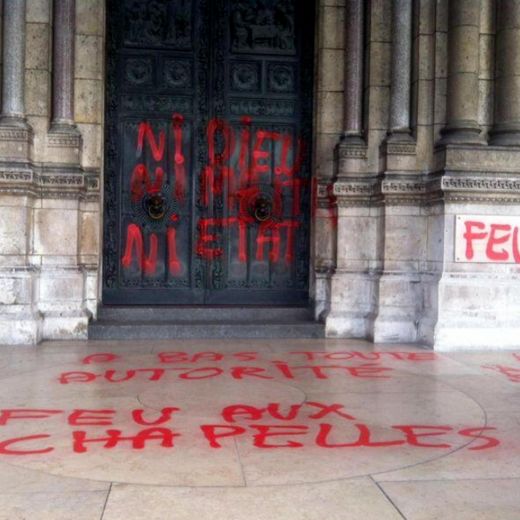 PARIGI – Scritte fatte con lo spray sulla chiesa simbolo di Parigi, la Basilica del Sacro Cuore a Montmartre. L’ingresso della chiesa, con vista mozzafiato sulla capitale, è stato imbrattato da scritte rosso fuoco, tra cui: ‘Né dio né Stato”, ”Fuoco alle cappelle”, ”Abbasso ogni autorità”.