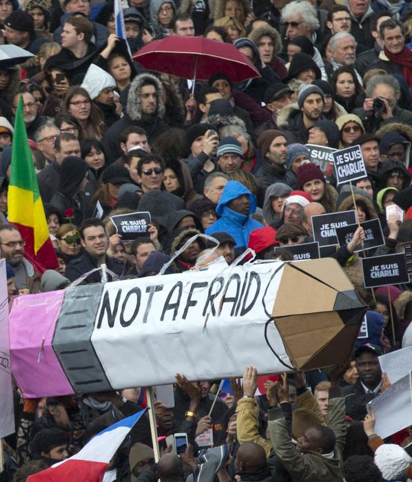 PARIGI – C’è anche una matitona gigante con la scritta “not afraid” (non ho paura), passata di mano in mano tra la gente, a place della Republique, la piazza parigina da cui è partita la grande marcia per la libertà.
