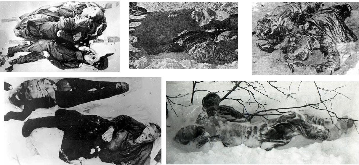 “Ventiquattro giorni dopo il misterioso incidente fu ritrovata la loro tenda: completamente sconquassata e lacerata dall’interno. Dai resti della tenda partivano delle orme. Seguendole, i volontari trovarono i primi cinque corpi dei ragazzi: alcuni completamente nudi, con le mani bruciate, altri solo con la biancheria intima, tutti senza segni esterni di violenza. Sparsi a poche centinaia di metri uno dall’altro, sotto un cedro. I cadaveri degli altri quattro furono rintracciati invece solo tre mesi dopo, sotto quattro metri di neve gelida. E con dei traumi inspiegabili e non prodotti da altri esseri umani per la loro potenza: cranio fracassato, cassa toracica compressa fino a spezzare le costole. E un corpo, quello di una ragazza, senza lingua”.