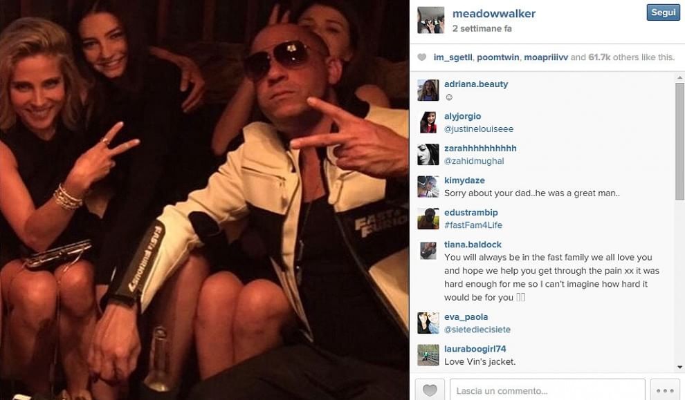 Meadow Walker, la figlia sedicenne di Paul, ha postato sul proprio profilo Instagram una foto che la ritrae bambina accanto al papà. In occasione della promozione del film, Meadow ha partecipato ad alcuni eventi con gli altri attori del cast, in particolare Vin Diesel ed Elsa Pakaty.
