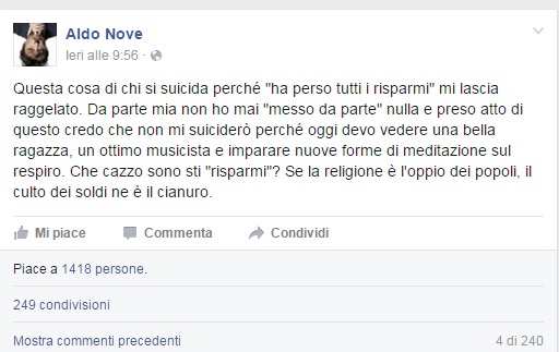 ROMA – “Questa cosa di chi si suicida perché ‘ha perso tutti i risparmi’ mi lascia raggelato. Da parte mia non ho mai ‘messo da parte’ nulla e preso atto di questo credo che non mi suiciderò perché oggi devo vedere una bella ragazza, un ottimo musicista e imparare nuove forme di meditazione sul respiro. Che cazzo sono ‘sti ‘risparmi’? Se la religione è l’oppio dei popoli, il culto dei soldi ne è il cianuro”.