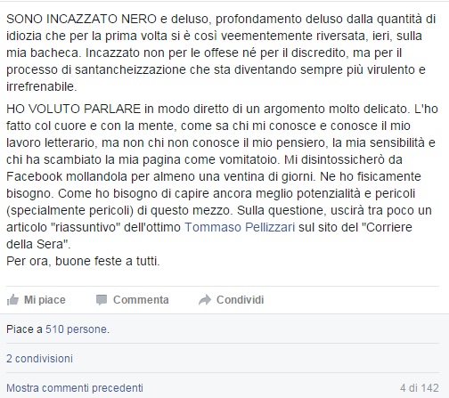 “Sono incazzato nero e deluso, profondamente deluso, dalla quantità di idiozia che per la prima volta si è così veementemente riversata, ieri, sulla mia bacheca. Incazzato non per le offese né per il discredito, ma per il processo di santancheizzazione che sta diventando sempre più virulento e irrefrenabile. Ho voluto parlare in modo diretto di un argomento molto delicato. L’ho fatto col cuore e con la mente, come sa chi mi conosce e conosce il mio lavoro letterario, ma non chi non conosce il mio pensiero, la mia sensibilità e chi ha scambiato la mia pagina come vomitatoio. Mi disintossicherò da Facebook mollandola per almeno una ventina di giorni. Ne ho fisicamente bisogno. Come ho bisogno di capire ancora meglio potenzialità e pericoli (specialmente pericoli) di questo mezzo”.