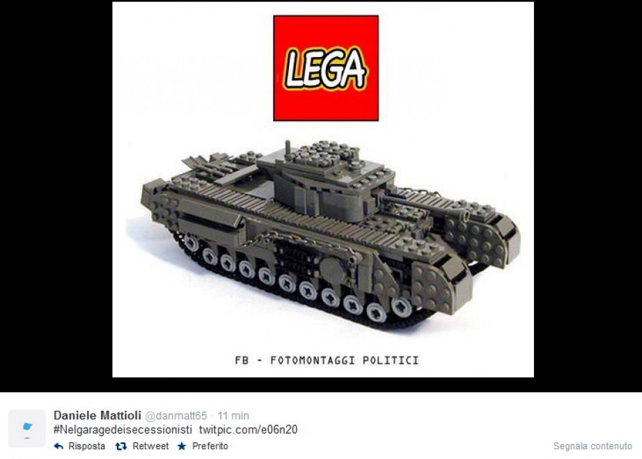 In tanti , infatti, non prendono sul serio la minaccia dei “venetisti”. Così su Twitter piovono fotomontaggi e a stimolare più la fantasia è ovviamente il trattore modificato in carro armato sequestrato mercoledì vicino Padova. In un montaggio alla guida del mezzo spunta Peppa Pig. In un altro la scritta “Lego” (il marchio di costruzioni) diventa “Lega”.