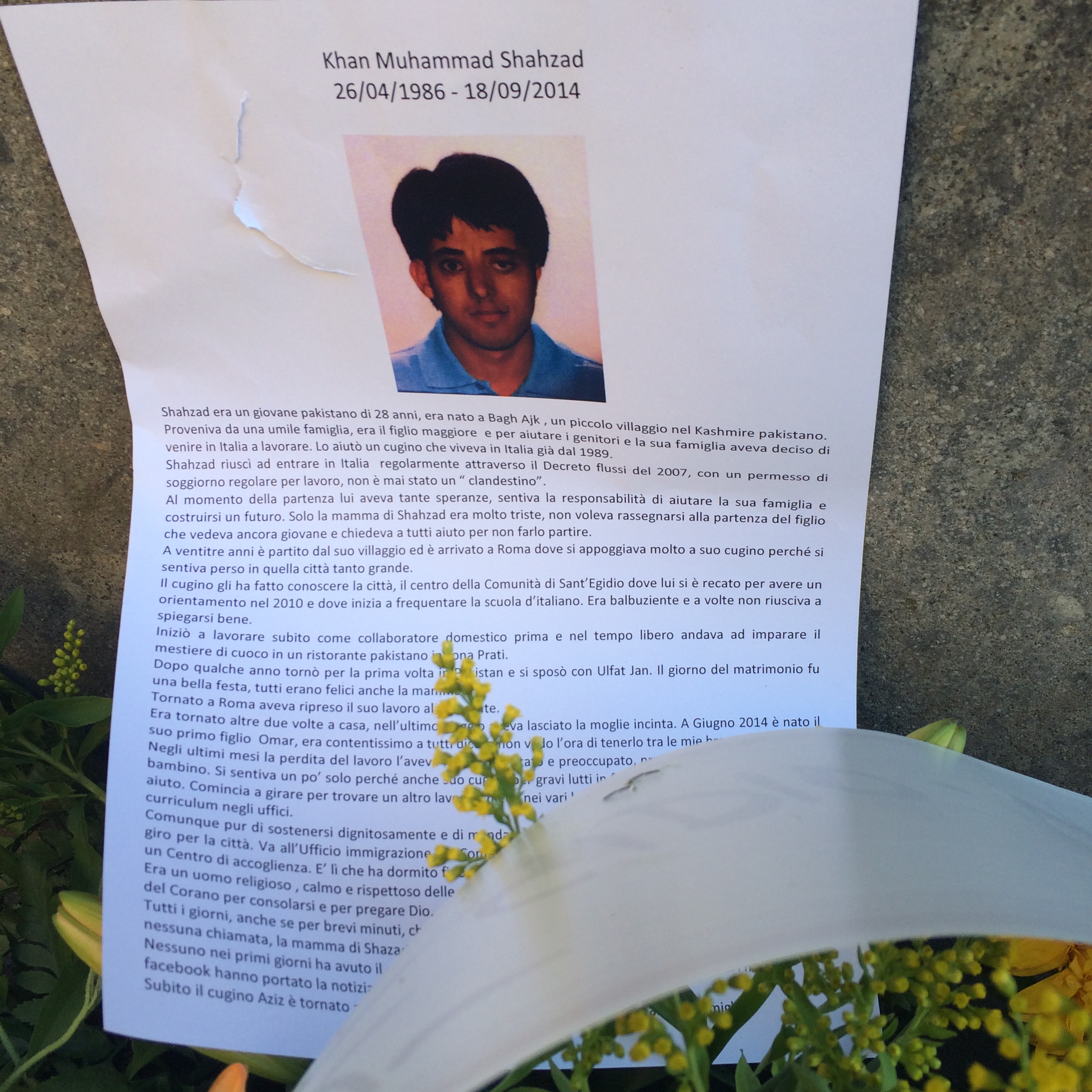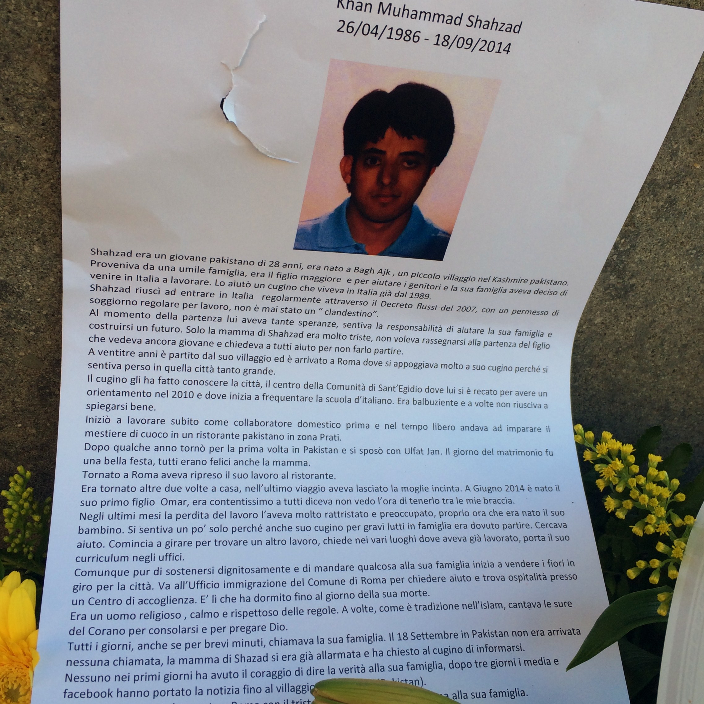 La ricostruzione della biografia di Shahzad aiuta a capire meglio il contesto della sua morte violenta. Era nato a Bagh Ajk City, nel Kashmir pakistano, il 28 aprile 1986. Primogenito di una famiglia povera, a 21 anni era partito per l’Italia. Si era messo subito in regola con il permesso di soggiorno sfruttando il decreto flussi del 2007, aiutato da un cugino che era in Italia dal 1989. Aveva iniziato a lavorare subito come collaboratore domestico, e nel tempo rimanente come cuoco nel ristorante pakistano di suo zio, in zona Prati. Nel 2010 si era messo a frequentare la scuola d’italiano alla Comunità di Sant’Egidio. Ma il suo problema più grande nel farsi capire era la sua balbuzie.