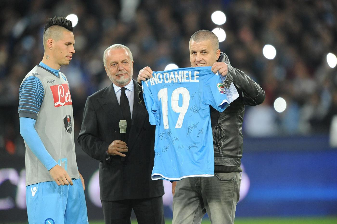 NAPOLI, STADIO SAN PAOLO – “Se Napul’e’ sarĂ inno del Napoli Pino ne sarĂ felice”. Lo ha detto Nello Daniele, fratello del cantautore scomparso, ricordando l’artista con il presidente del Napoli De Laurentiis al centro del campo dello stadio San Paolo. Al termine della cerimonia De Laurentiis ha consegnato a Nello Daniele una maglia con la scritta Pino Daniele e il numero 19. “Pino, Pino”, con lo stesso ritmo con cui scandivano il nome di Maradona, lo stadio San Paolo, a Napoli, ha cantato stasera il nome di Pino Daniele prima della sfida contro la Juventus.