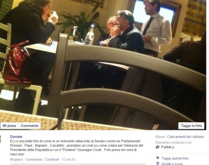 ROMA – Pippo Civati parla con alcuni ex 5 stelle in un ristorante romano. La foto gira su internet ed è stata scattata da un paparazzo. L’incontro avviene subito dopo l’addio di altri nove deputati del movimento fondato da Grillo e un utente, dopo aver visto la foto, ha prontamente commentato: “Ecco una bella foto di come in un ristorante adiacente al Senato i nostri ex Parlamentari Romani, Pepe, Bignami, Casaletto, prendano accordi su come votare per l’elezione del Presidente della Repubblica con il “Pontiere” Giuseppe Civati. Foto presa ieri sera di nascosto”. L’esponente di minoranza dem non ha però gradito quel “prendano accordi”, è andato su tutte le furie ed ha subito risposto spiegando, sul suo blog, quello che è realmente accaduto: