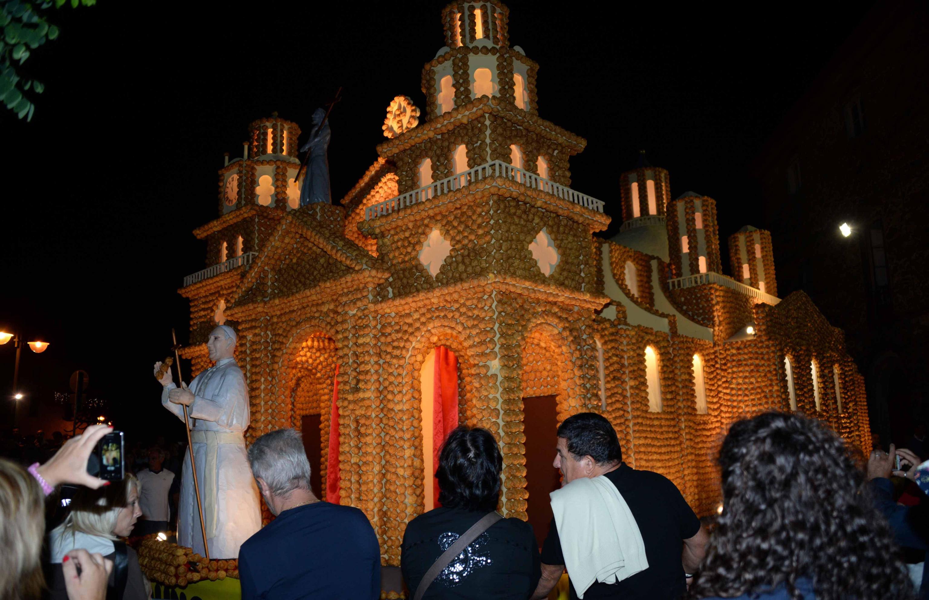 ORENTANO (PISA) – Ci sono voluti più di centomila bignè per realizzare il dolce-monumento che ieri sera è stato presentato a Orentano, nel comune di Castelfranco di sotto (Pisa). Il dolce da guinness era dedicato a Papa Francesco ed è stato ammirato da migliaia di spettatori. Il monumentale bignè raffigurava la cattedrale di Cordoba in Argentina dove Bergoglio è stato ordinato sacerdote.