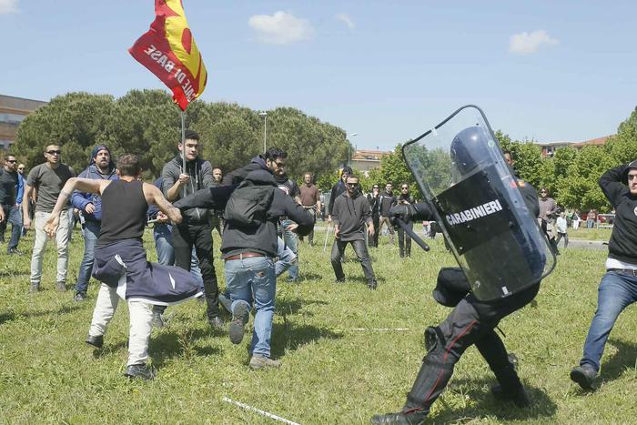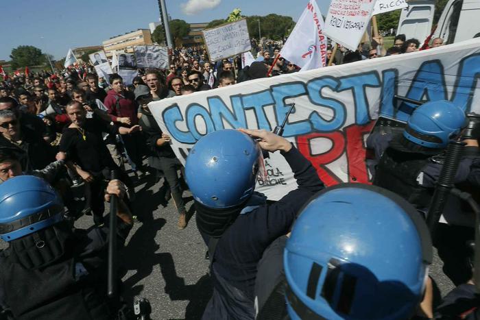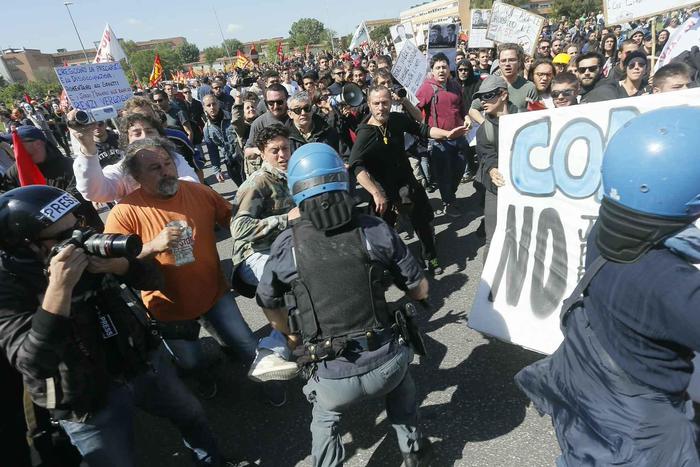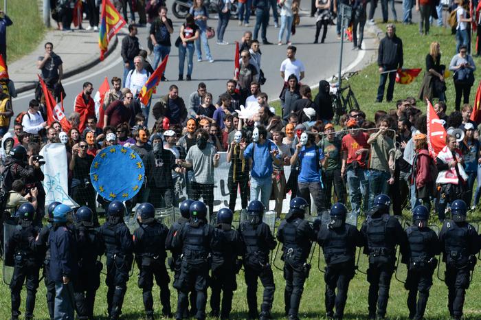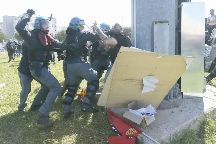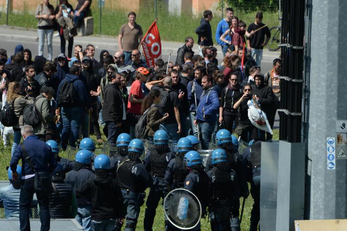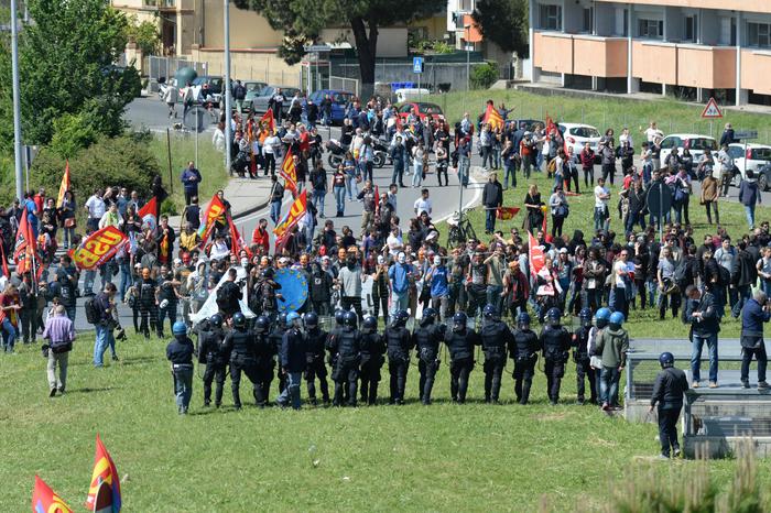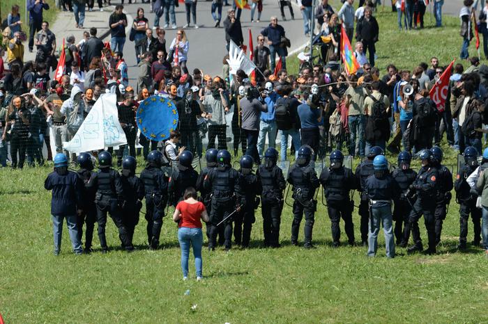 Quando i manifestanti hanno raggiunto la rete, si sono avvicinati minacciosamente al cordone di poliziotti schierati a protezione, gli agenti hanno allontanato i giovani in testa al corteo, appartenenti all’area antagonista, con un paio di cariche di alleggerimento. I manifestanti hanno reagito con un fitto lancio di oggetti e ortaggi. La situazione è poi tornata alla normalità. Il corteo, composto da oltre 500 persone molte delle quali giunte anche da fuori città, aveva attraversato le principali vie del centro senza disordini.