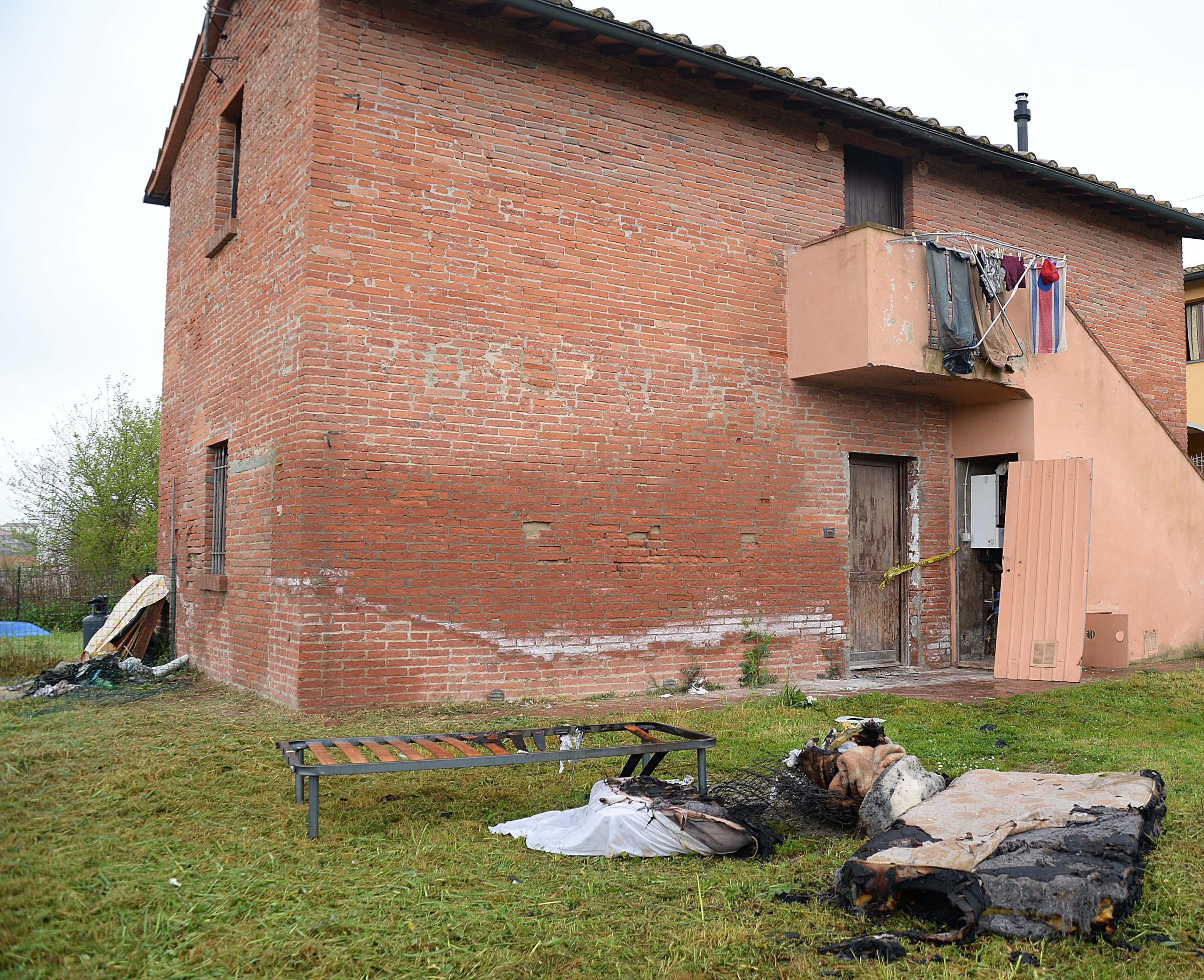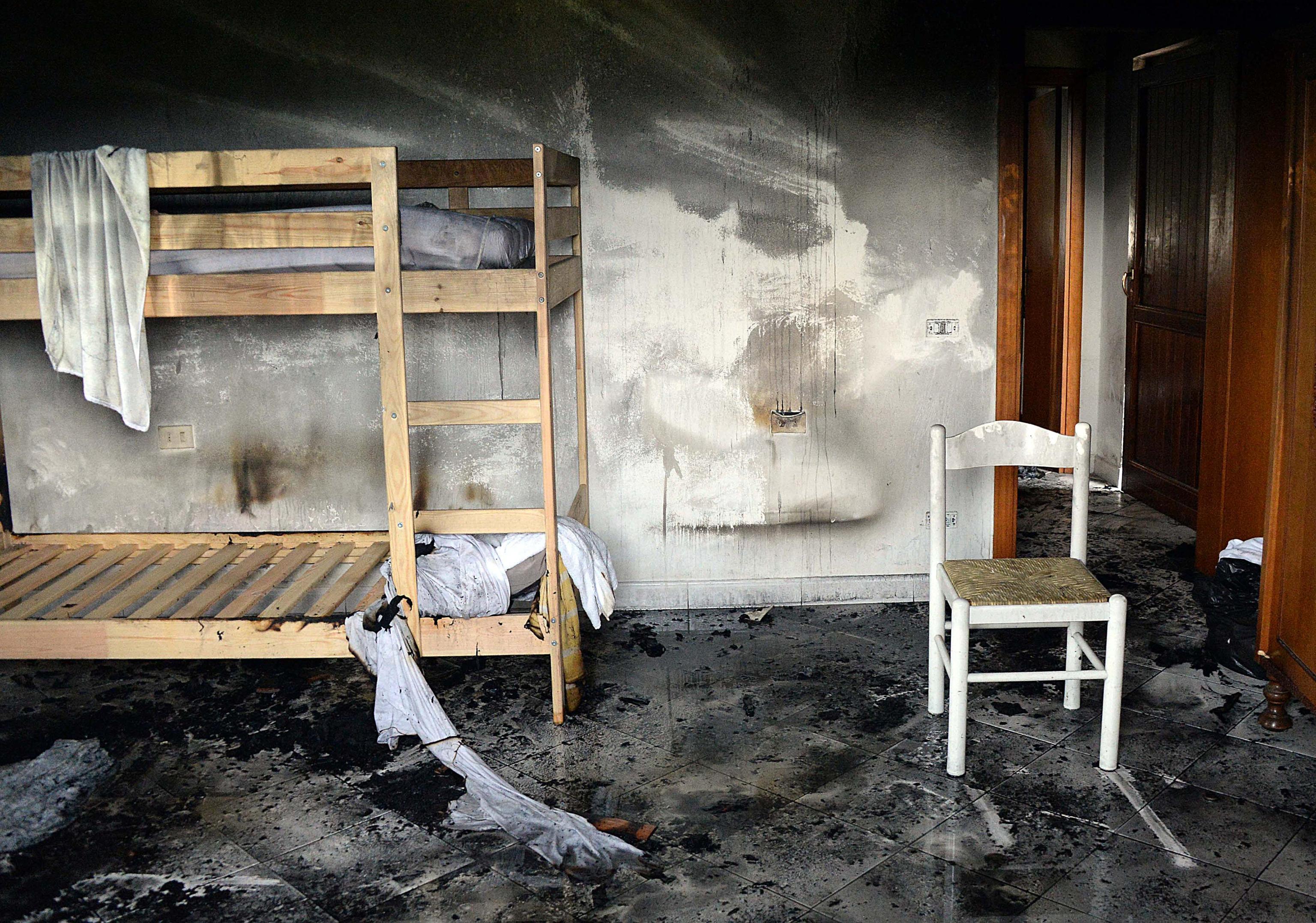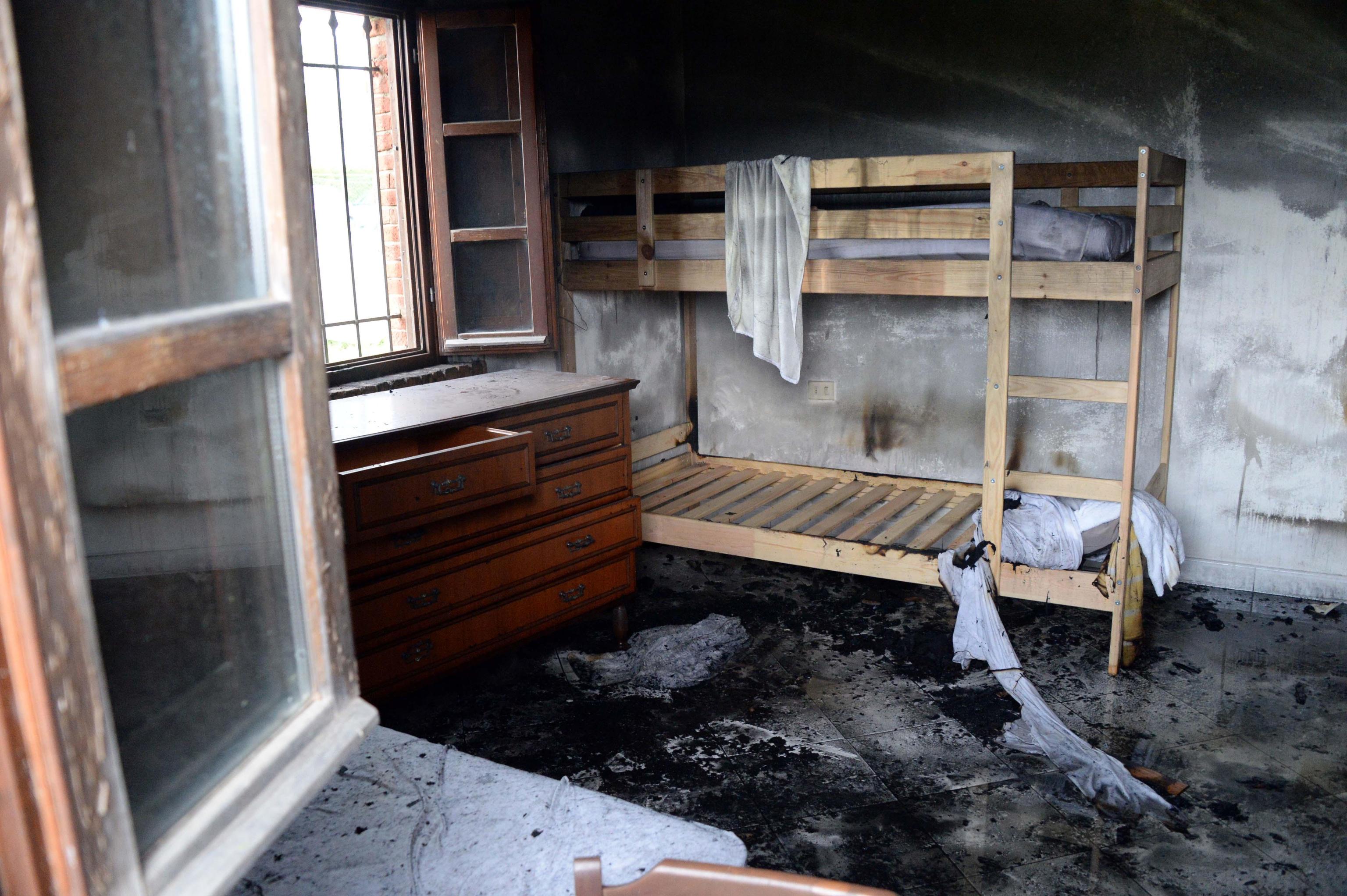 Al momento dell’incendio la casa era vuota e i tre somali che la abitavano risultano irreperibili. Le foto Ansa dell’immobile bruciato.