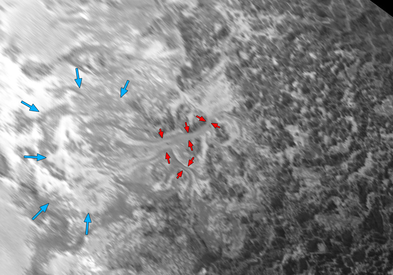 Nelle foto si vede un primo piano delle maestose montagne alte 3.500 metri che ‘incorniciano’ parte della distesa di ghiaccio d’azoto, chiamata Sputnik, nel cosiddetto ‘cuore’ di Plutone. Alle spalle della pianura di azoto congelato le foto rivelano strutture simili a fiumi di ghiaccio, che secondo la Nasa somigliano ai flussi di ghiaccio che scorrono ai margini della calotte polari, in Groenlandia e Antartide. La sonda ha immortalato anche gli strati di foschia che si estendono fino a 100 chilometri dalla superficie. Will Grundy, del Lowell Observatory, a Flagstaff, ha detto:
