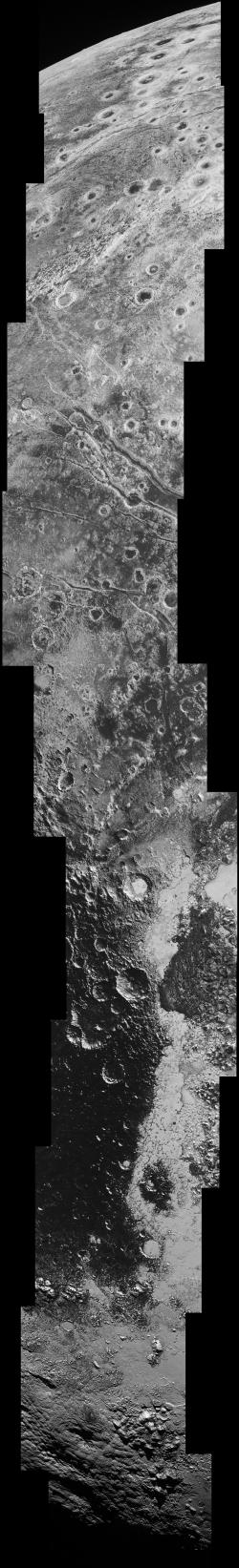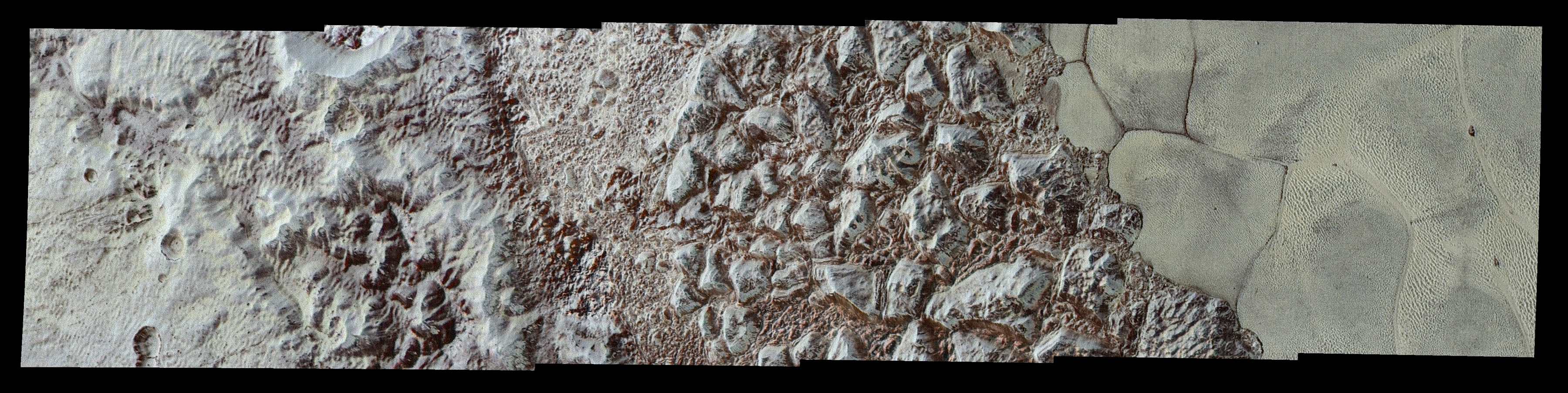 Secondo i modelli informatici di New Horinzons, queste masse, un po’ simili al famoso ‘blob’ dell’omonimo film, finiscono per fondersi nell’arco di milioni di anni e la X fotografata potrebbe essere il punto dove si incontrano queste celle. New Horizons, combinando insieme i dati di due diversi strumenti, ha poi realizzato un’immagine composita di quella che è stata chiamata la Terra dei Vichinghi di Plutone, con scie che fanno pensare a canali.