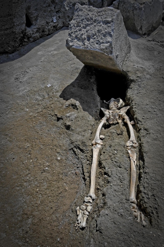 Il povero fuggiasco claudicante deve aver tentato il tutto per tutto. Ma non ce l’ha fatta. Un masso enorme lo ha investito colpendolo al busto, con tutta probabilità staccandogli di netto la testa. Gli archeologi lo hanno trovato riverso sulla schiena, la parte alta del busto ancora coperta dalla pietra. Ora saranno le analisi di laboratorio a ricostruirne con più certezza la storia.