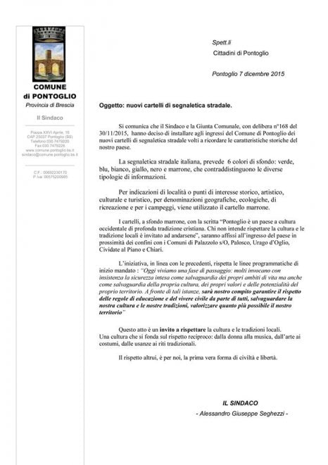 BRESCIA – “Paese a cultura occidentale e di profonda tradizione cristiana”. E’ il messaggio anti islam, chiaro ed inequivocabile, che trovate a Pontoglio, in provincia di Brescia. Il sindaco di centrodestra Alessandro Seghezzi, lo ha fatto scrivere su tutti i cartelli stradali all’ingresso della cittadina con tanto di avvertimento: “Chi non intende rispettare la cultura e le tradizioni locali è invitato ad andarsene”.