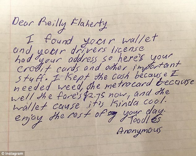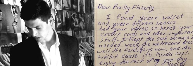 Come riporta Metro.uk infatti l’uomo stava controllando la casella di posta quando ha trovato una lettera scritta a mano e firmata da un anonimo. All’interno della busta c’era la sua patente e le carte di credito. “Caro Reilly Flaherty”, esordisce il testo. “Ho trovato il tuo portafoglio. Ho pensato di ridarti la patente e la carta di credito perché molto importanti. Ma ho tenuto i soldi perché con quelli mi posso comprare la marijuana, la carta della Metro perché le tariffe sono salite a 2,75 $ e il portafogli perché è davvero cool. Goditi la giornata, un anonimo”.
