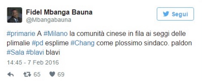 “#Primarie A #Milano la comunità cinese in fila ai seggi delle plimalie #pd esplime #Chang come plossimo sindaco. paldon #Sala #blavi blavi”.