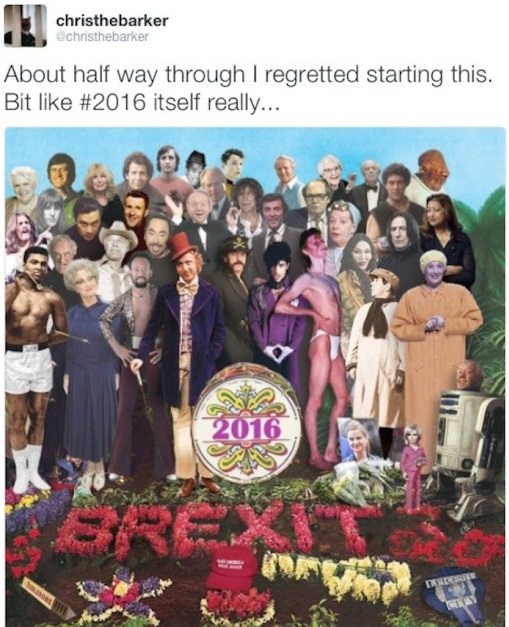 Al posto dei volti sullo sfondo,l’ utente Twitter che si fa chiamare Christhebarker ha sostituito quelli originali con i volti delle celebrità scomparse nel corso dell’ultimo anno. Ed è così che nella nuova copertina troviamo i volti di Prince, Lemmy Kilmister, David Bowie, Gene Wilder, Mohammed Alì e tantissimi altri. E non mancano i riferimenti anche ad alcuni episodi che hanno caratterizzato l’ultimo anno come la Brexit e l’elezione di Donald Trump alla presidenza degli Stati Uniti.