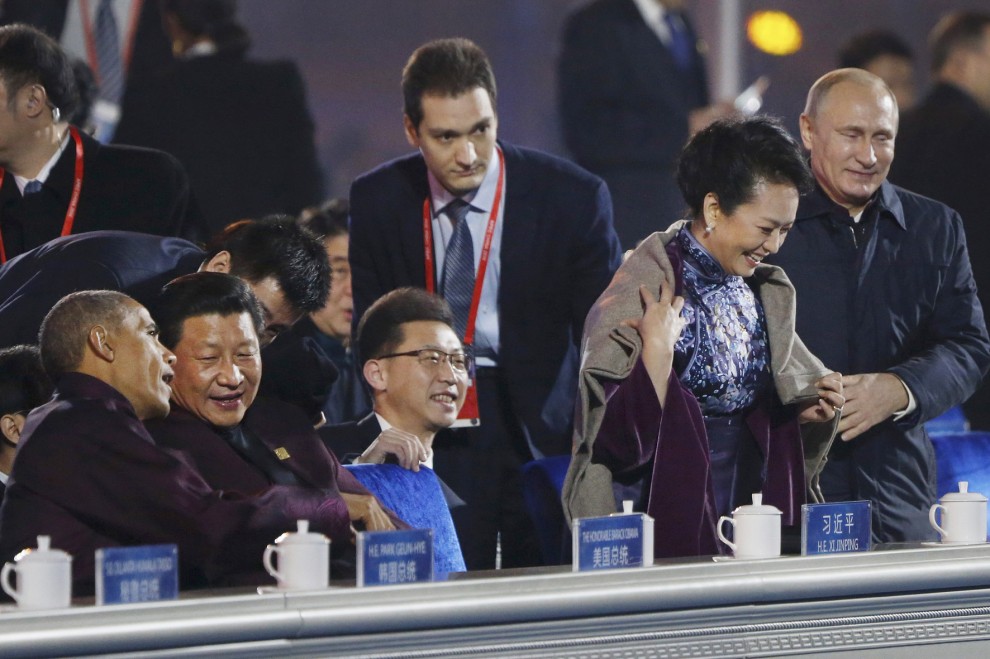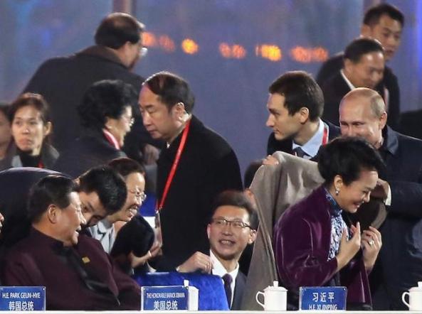 Putin copre le spalle alla signora Peng Liyuan, la moglie di Xi Jinping, durante la serata organizzata al Water Cube, lo stadio del nuoto nel villaggio olimpico dei Giochi 2008, che prevede lo spettacolo di fuochi d’artificio e banchetto a cui partecipano diversi capi di stato.