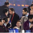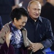 Putin copre le spalle alla signora Peng Liyuan, la moglie di Xi Jinping, durante la serata organizzata al Water Cube, lo stadio del nuoto nel villaggio olimpico dei Giochi 2008, che prevede lo spettacolo di fuochi d’artificio e banchetto a cui partecipano diversi capi di stato.