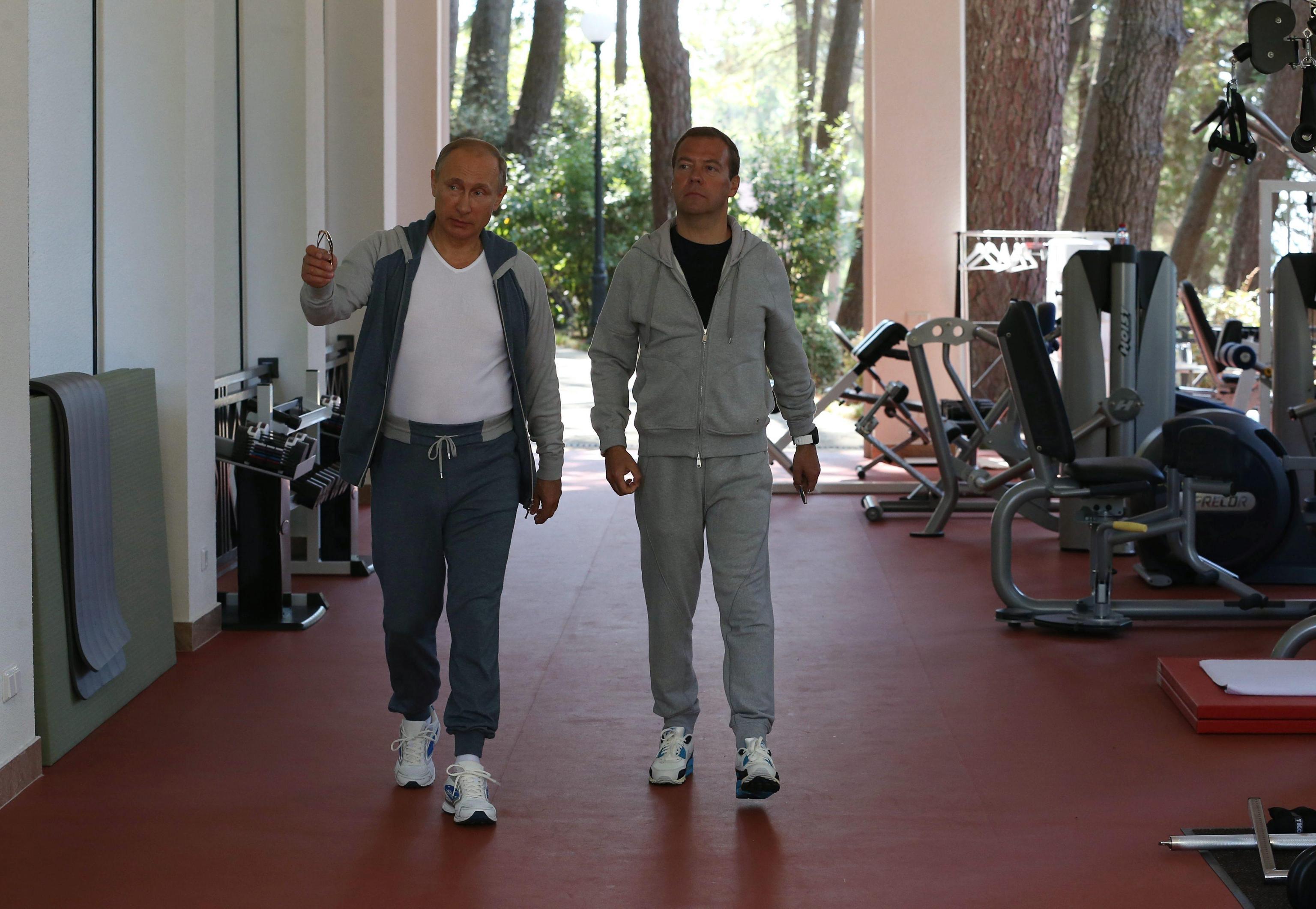 epa04905648 Russian President Vladimir Putin (L) and Russian Prime Minister Dmitry Medvedev (R) in a gym at the Bocharov Ruchei residence in Sochi., Russia, 30 August 2015. EPA/EKATERINA SHTUKINA/RIA NOVOSTI/GOVERNMENT PRESS SERVICE