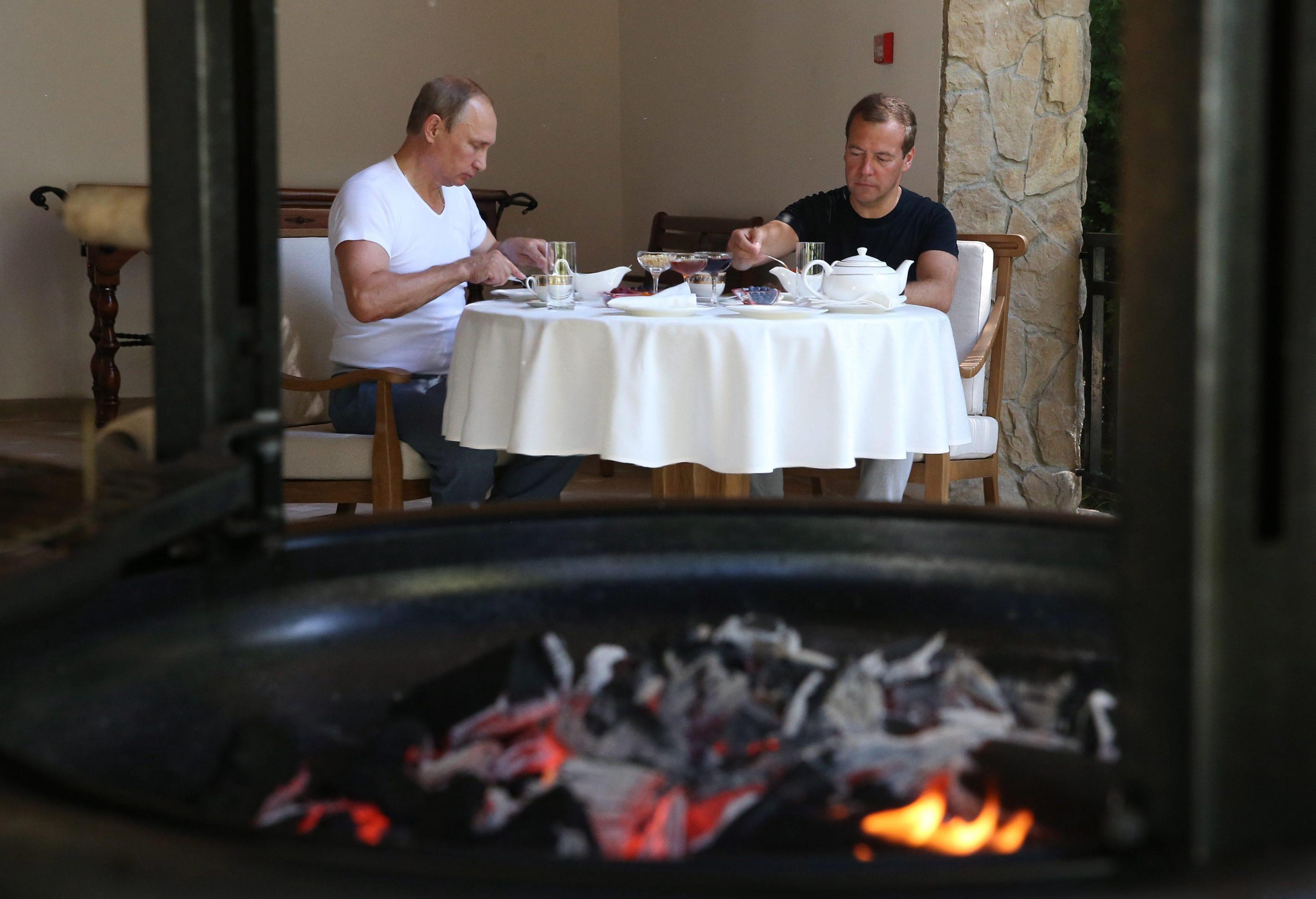 epa04905605 Russian President Vladimir Putin (L) and Russian Prime Minister Dmitry Medvedev (R) have a breakfast at the Bocharov Ruchei residence in Sochi., Russia, 30 August 2015. EPA/EKATERINA SHTUKINA/RIA NOVOSTI/GOVERNMENT PRESS SERVICE