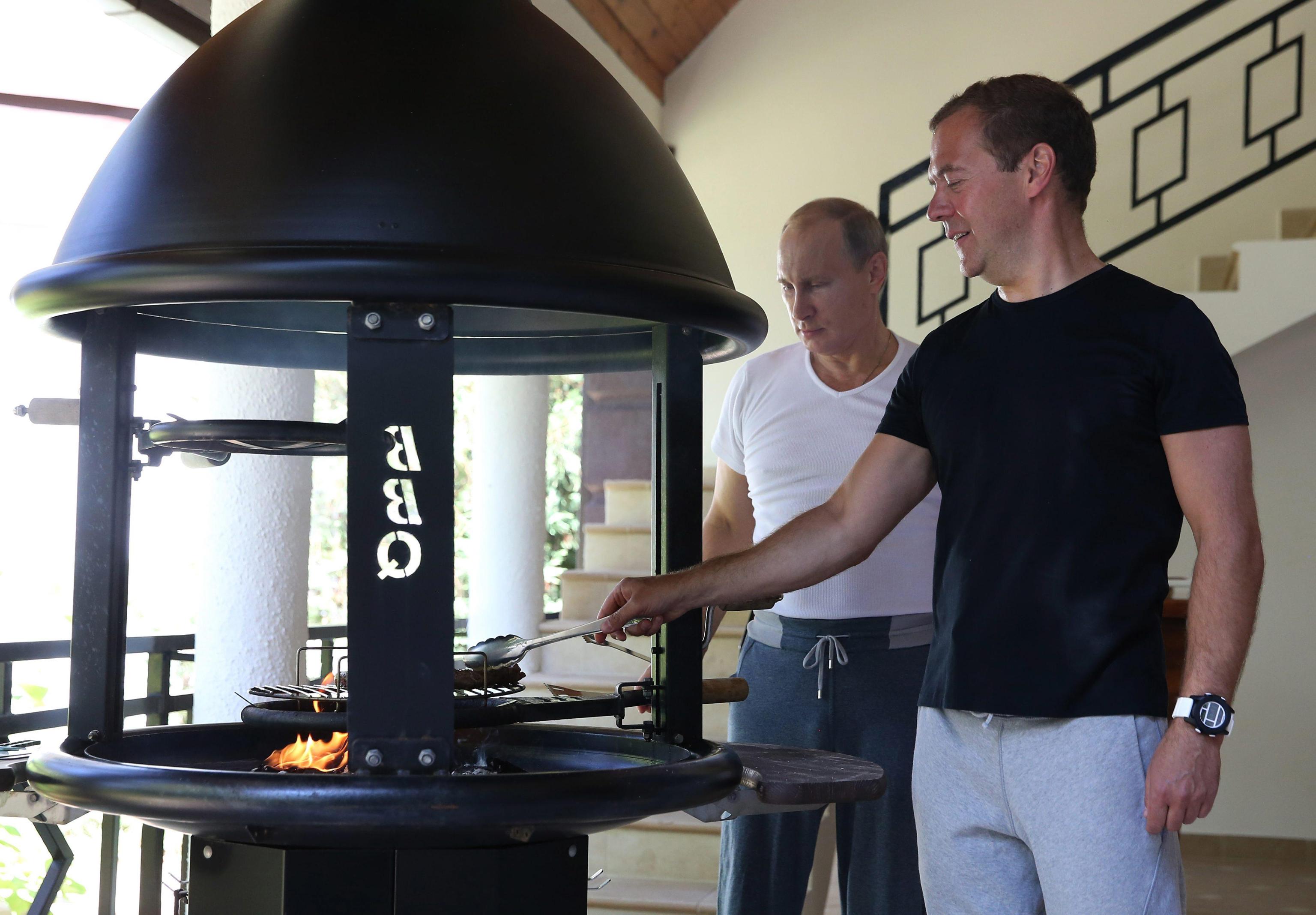 epa04905607 Russian President Vladimir Putin (L) and Russian Prime Minister Dmitry Medvedev (R) cook a grilled breakfast at the Bocharov Ruchei residence in Sochi., Russia, 30 August 2015. EPA/EKATERINA SHTUKINA/RIA NOVOSTI/GOVERNMENT PRESS SERVICE