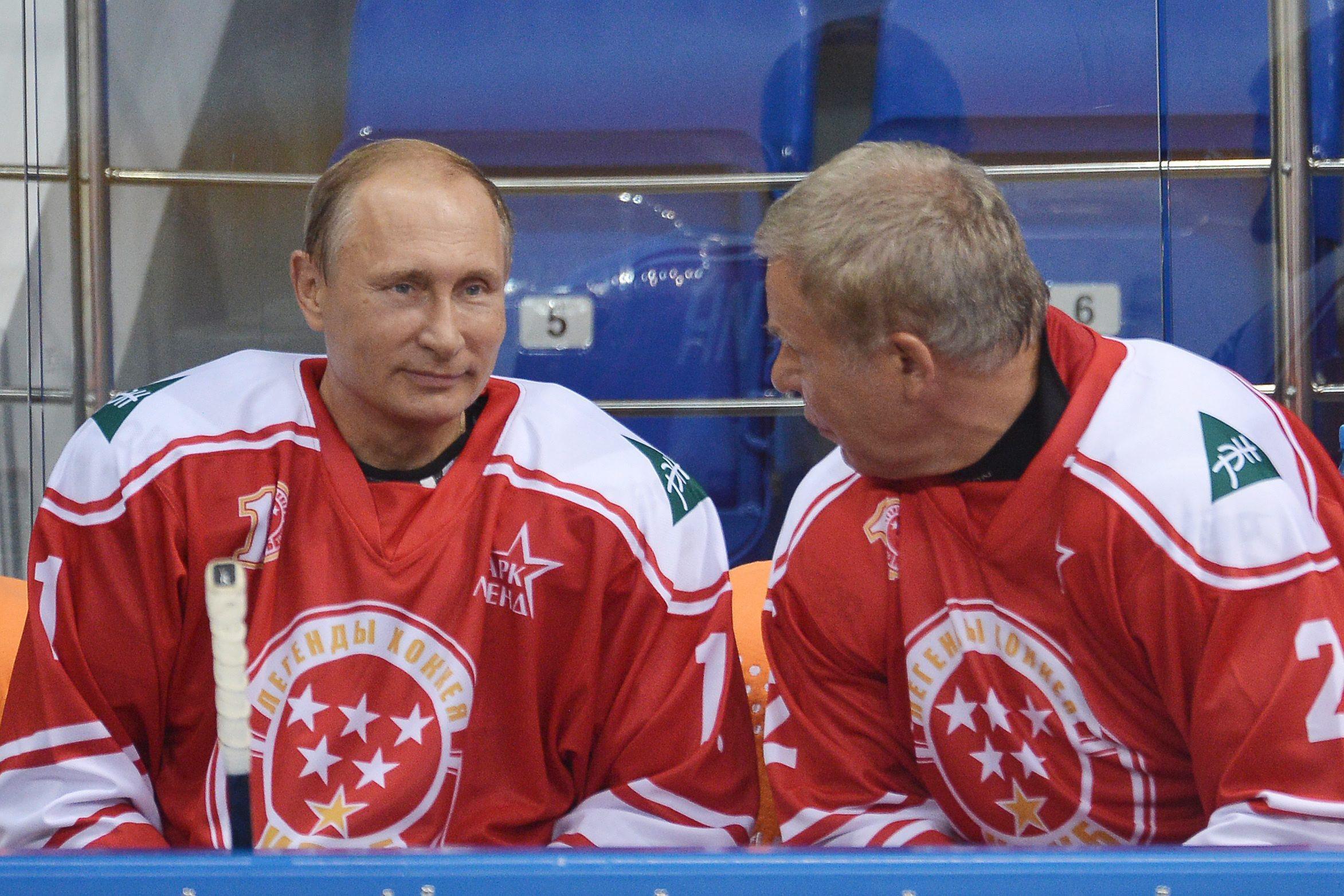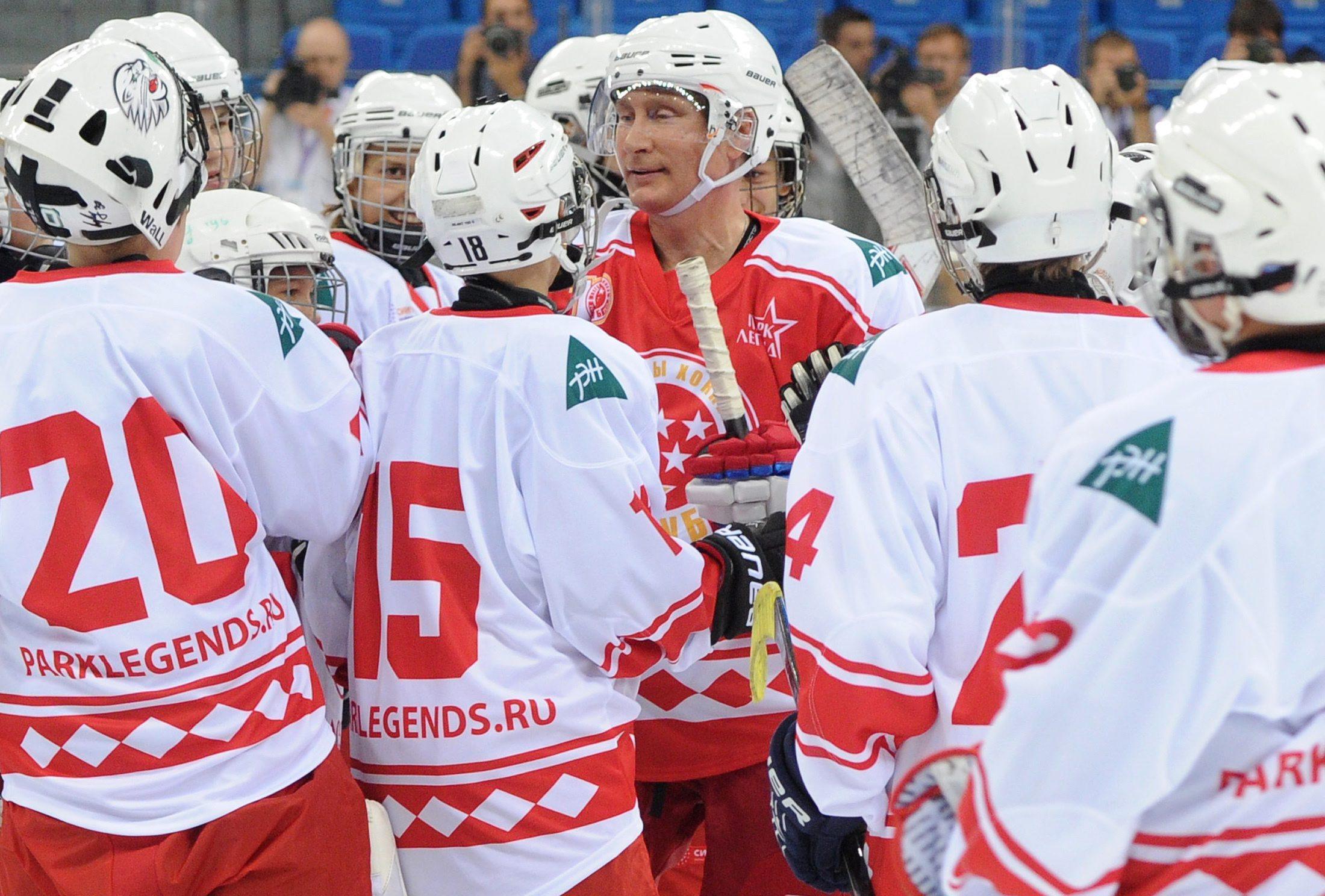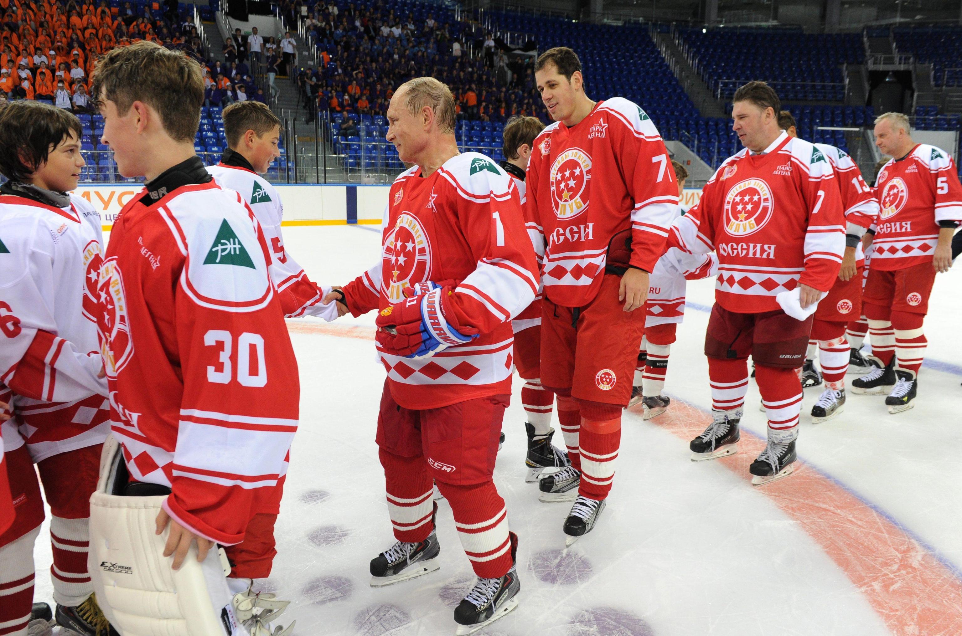 epa04907983 Russian President Vladimir Putin (C) takes part in a match between former Russian ice hockey stars and students of the Sirius college for gifted children in the Black Sea resort in Sochi, Russia, 01 September 2015. EPA/MIKHAIL KLEMENTEV / RIA NOVOSTI / POOL