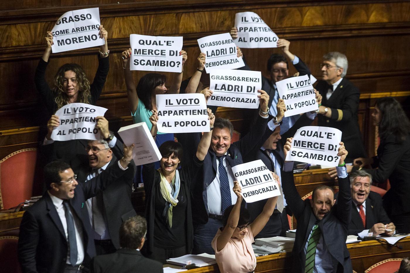 In uno dei cartelli esposti si legge “qual’è la merce di scambio?”, con l’apostrofo tra “qual” ed “è”. Molti senatori democratici hanno rilanciato le foto su Twitter e su Facebook. Ecco il cartello con l’errore grammaticale (foto LaPresse):