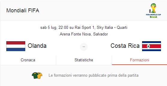 Olanda-Costa Rica si giocherร alle 22 (trasmessa anche sulla Rai), Argentina-Belgio alle 18, in onda solo su Sky.