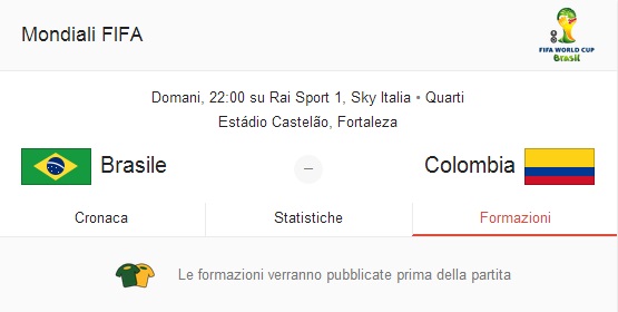 ROMA – Brasile-Colombia e Francia Germania: sono questi i primi due quarti di finale del Mondiale brasiliano che si giocheranno domani, venerdรฌ 4 luglio 2014.