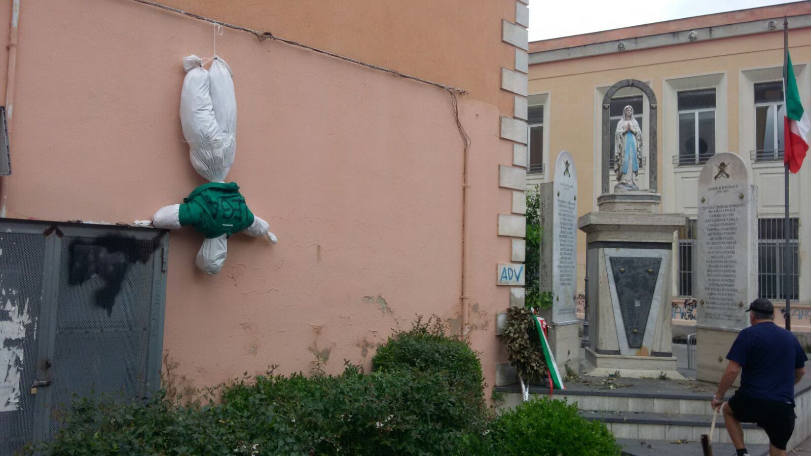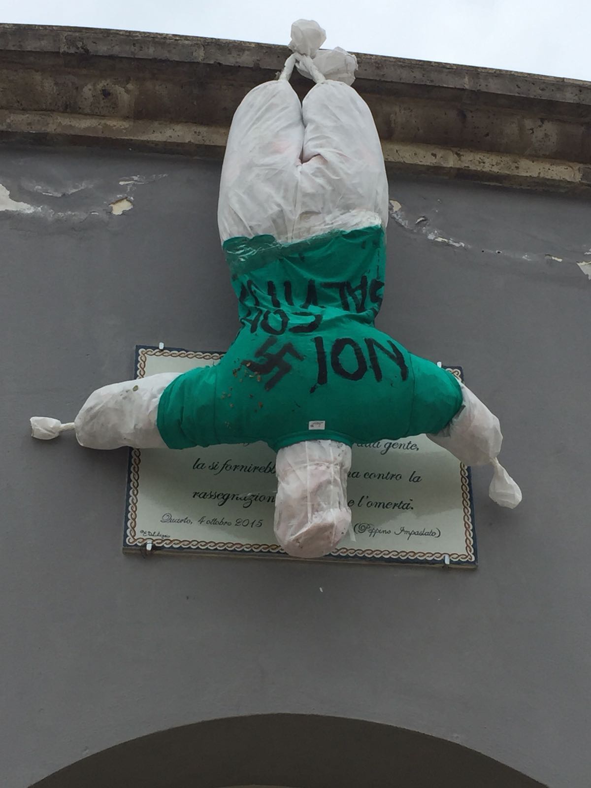 NAPOLI – Due fantocci “anti-Salvini” appesi a testa in giù e con una svastica sono apparsi il 6 maggio a Quarto, in provincia di Napoli. I due fantocci sono stati posizionati proprio a qualche metro dal monumento che ricorda i caduti nelle due guerre mondali. Massimo Caradente Giarrusso, candidato sindaco del centrodestra in città, lo ha definito “un gesto vile e stupido”. Matteo Salvini ha commentato: “Vigliacchi, ci fate pena”. La polizia indaga sull’accaduto.