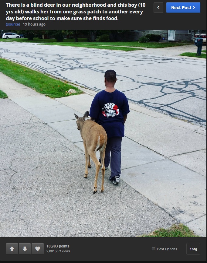ROMA – Sulla piattaforma Reddit circola una foto che mostra un bambino di dieci anni che accompagna una femmina di cervo ceca, in una cittadina degli Usa non specificata.