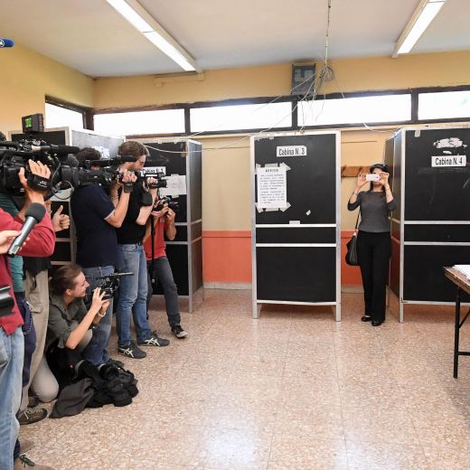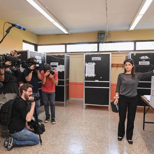 ROMA – Assedio di giornalisti e fotografi al voto della candidata M5s Virgilia Raggi, che ha votato nel primo pomeriggio nel seggio di via delle Maestre Pie Filippini nel quartiere Ottavia, periferia ovest della capitale.